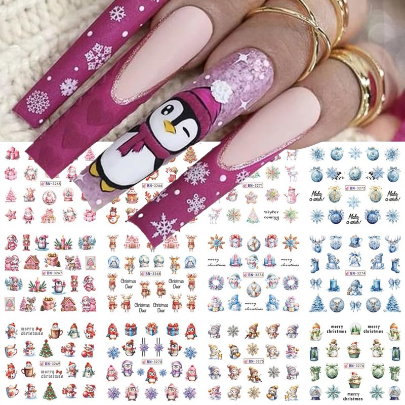 - ☃️DIY Christmas Sticker for Nails: Snowflake water transfer nail decals have different patterns such as elk, snowman, snowflake, gingerbread man, penguin, bell, Christmas trees, flower, etc. which can provide you with a variety of choices and let you use your rich imagination to nail DIY.