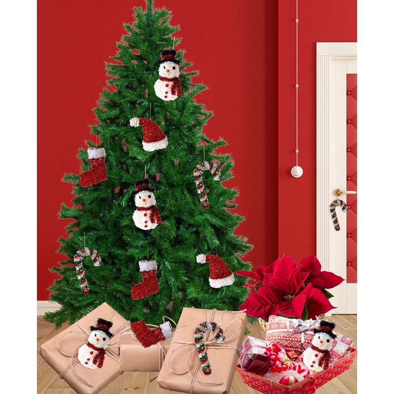 Christmas Ornaments - Snowman Santa Hat Candy Cane Stocking - Sparkly Tinsel Xmas Tree Ornaments - 4 Pcs.