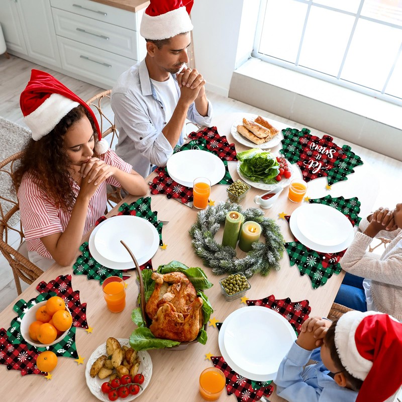 - High-Quality material:Buffalo plaid placemats are crafted from plastic.Christmas tree placemats are thoughtfully designed to be both waterproof and heat-proof, ensuring they can handle spills and hot dishes with ease.Christmas Shaped Table Mats are also odorless and made from reliable materials, making them a ideal choice for family gatherings and festive meals.