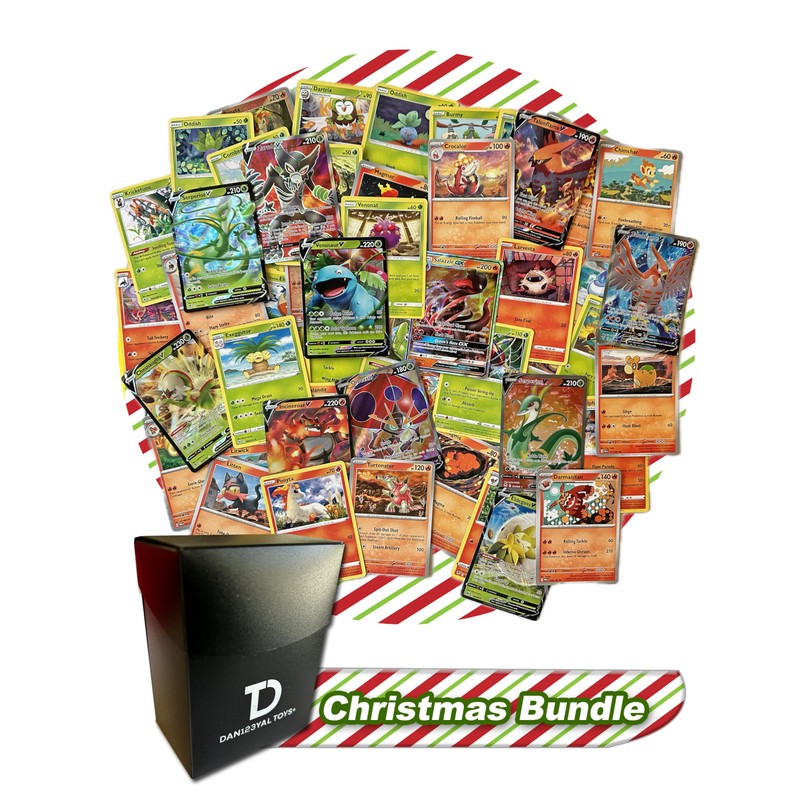 Christmas Pokémon Compatible TCG Random Assortment Bundle || Guaranteed Fire or Grass Ultra Rare + 20 Random Fire Or Grass Cards + Dan123yal Deck Box