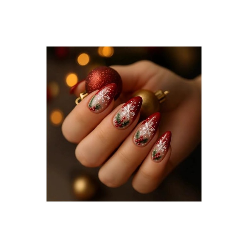Christmas Press on Nails Almond Snowflake Fake Nails Red French Tip Glue on Nail with Snowflake Holly Berries Designs Acrylic Nails Xmas Press on Nails Medium Almond Stick on Nail for Women