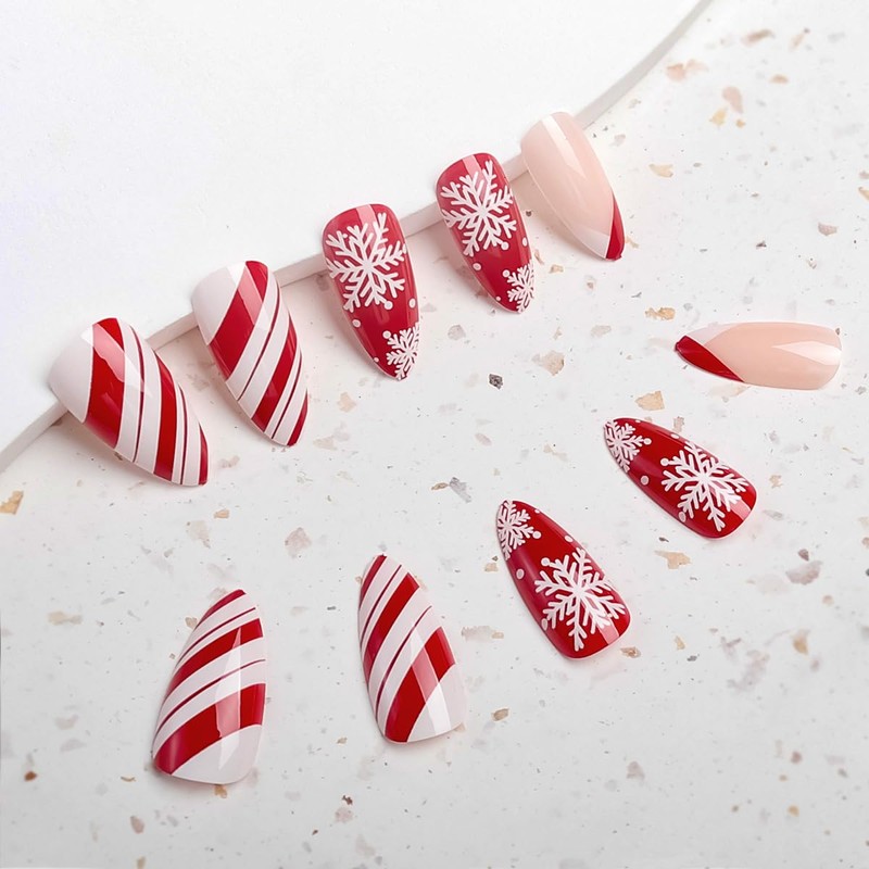 Christmas Press on Nails Medium Almond Red White Stipe Snowflake Fake Nails, French Xmas Press on Nails Gel Acrylic Nails Glue Stick on Nail Tip Reusable Natural Fit Winter False Nails Kit