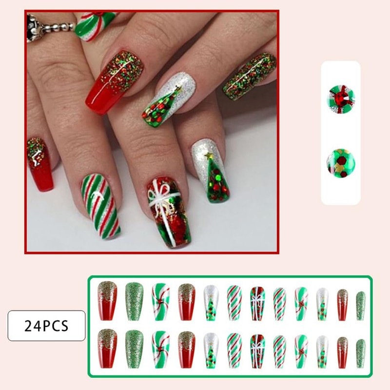 Christmas Press On Nails Medium Coffin Fake Nails With Glue, Christmas Nails Glue On,Christmas Nails Press On With Christmas Tree Green and Red Stripes Design Artificial Stick On Nails for Women-24Pcs