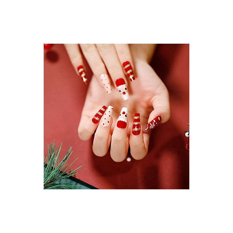- Festive Nail Designs: Get into the holiday spirit with this set of 24 press-on nails featuring Christmas-themed patterns like snowflakes, trees, and classic red and green colors.