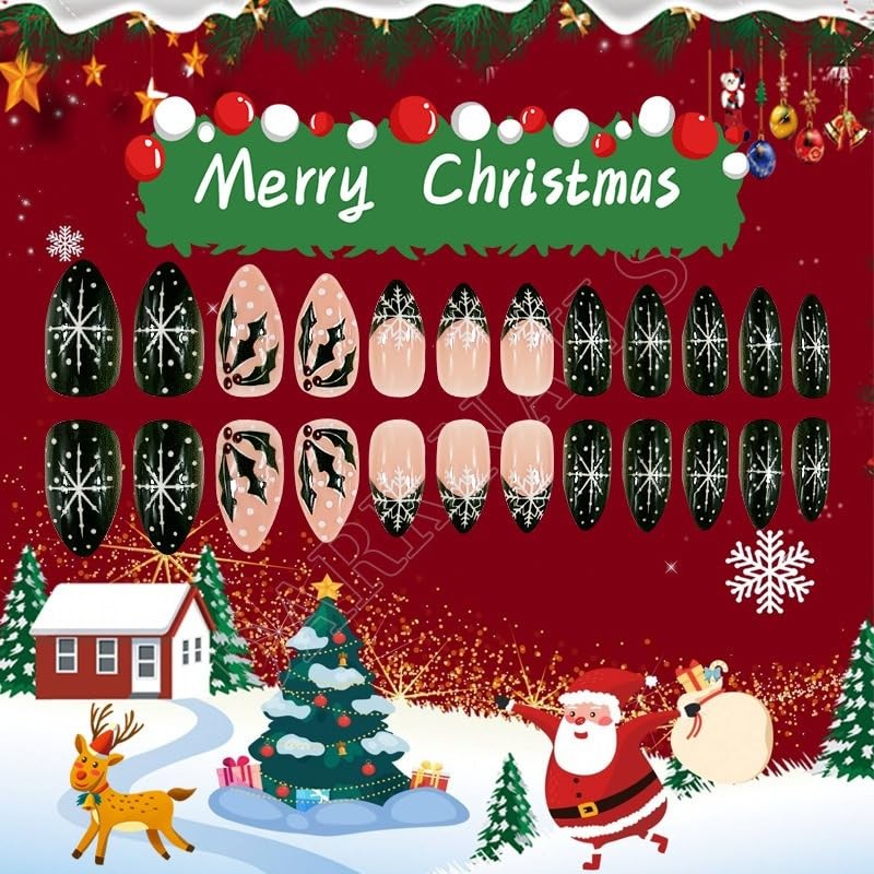 Christmas Press on Nails Short Square Fake Nails French Snowflake Christmas Fruit Designs Gloss False Nails Full Cover Stick Acrylic Artificial Nails for Women Glue on Nails(24PCS)