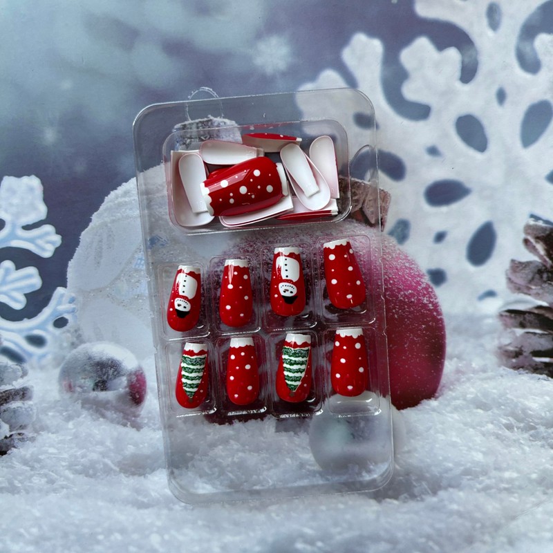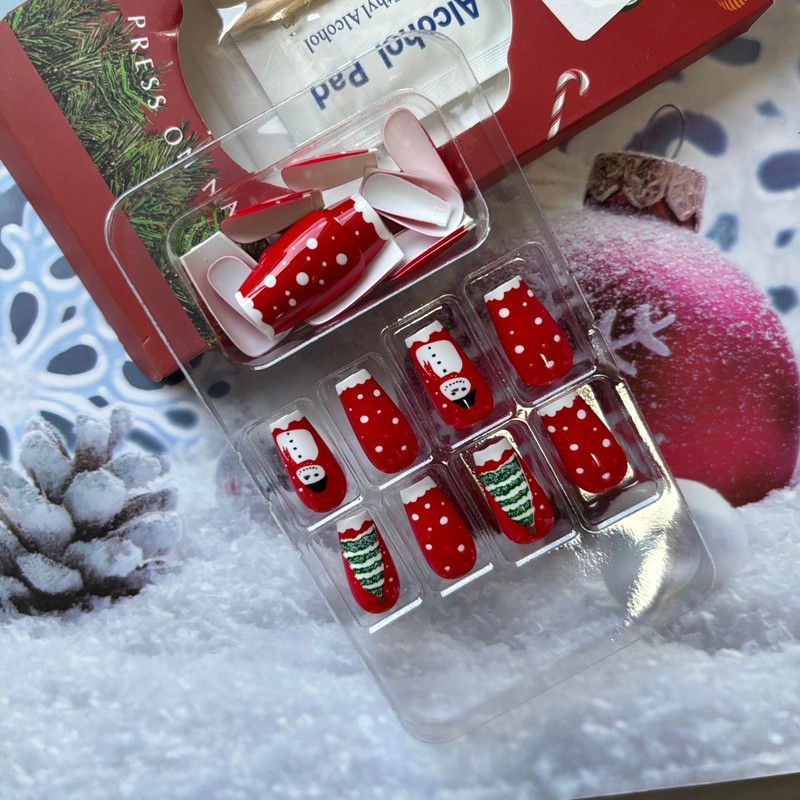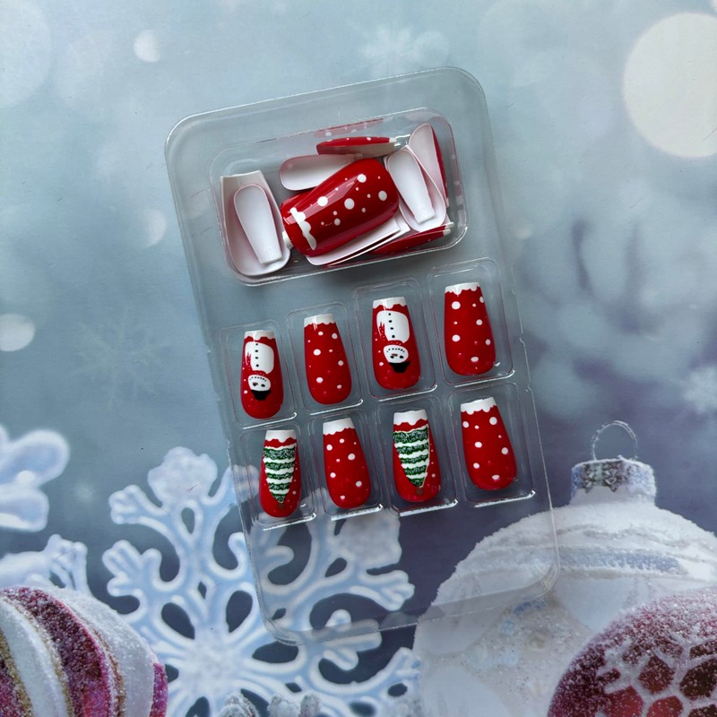 Christmas Press on Nails Short Square Fake Nails French Tip False Nails with Xmas Tree Snowman Designs Red White Dot Glue on Nails Stick on Nails Full Cover Winter Acrylic Nails Glossy Artificial Nail