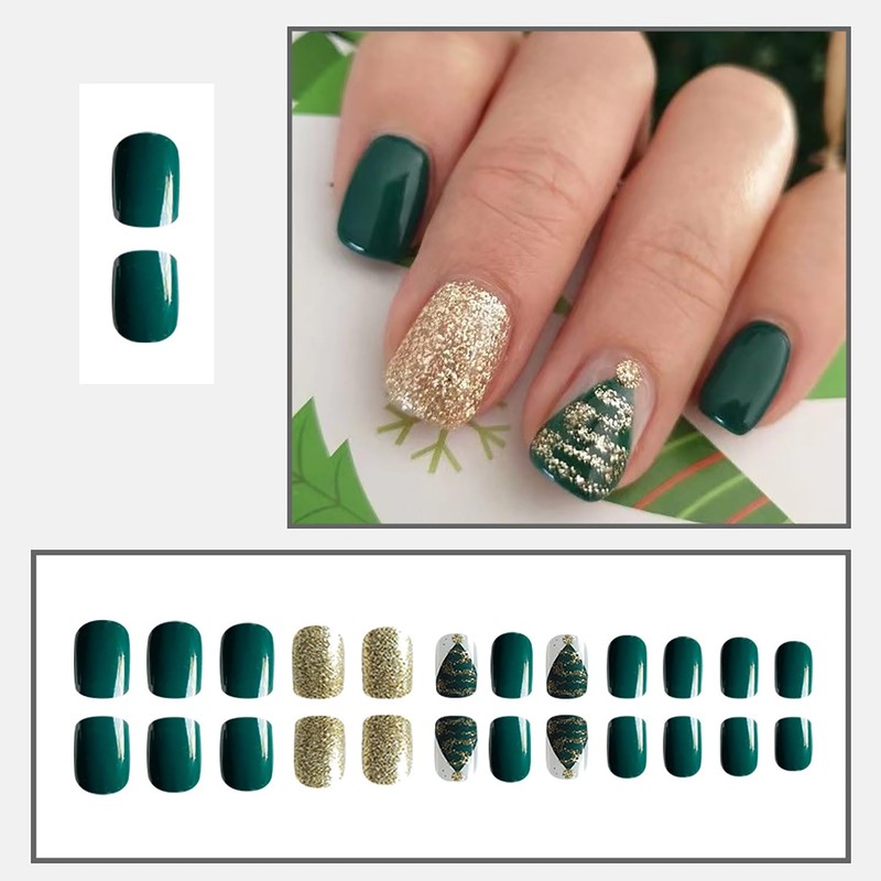 Christmas Press On Nails Short Square Fake Nails Green Christmas Nails Press Ons Full Cover False Nails With Christmas Tree Designs Acrylic Glue On Nails Gold Glitter Stick On Nails For Women