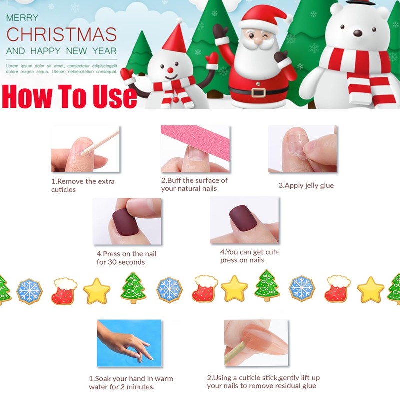 - Easy to use: After trimming and cleaning your natural nails, select the right sizes of our high quality nails and apply our nail adhesive tape on, then press on your nails for 20 seconds. Now you have beautiful new Christmas acrylic nails