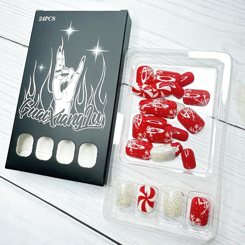 - Xmas Nails Set: 24Pcs Xmas press on nails short +1 nail file + 24pcs jelly glue stickers+1 wooden stick. Durability of jelly glue is not as good as liquid glue, but it makes snowflake acrylic artificial nails reusable