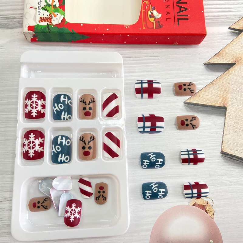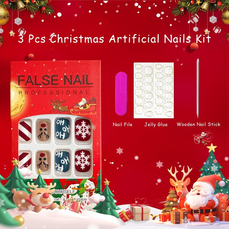 - Christmas Glue on Nails Kit: Package with 24pcs short square artificial finger nails, 1 sheets jelly glue stickers, 1pcs nail file, 1pcs wooden stick. 12 sizes fake nails can reusable, suitable for different size of nails
