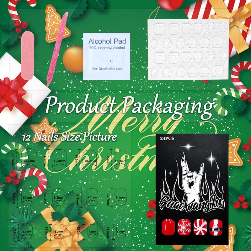 - Package List: 24 pcs xmas press on nails kit, each box includes 24 fake nails, 1 sheet of 24 adhesive nail tabs, 1 cuticle stick, 1 nail file and 1 pack of alcohol cotton.(Glitter is easy to fall off, please apply an extra layer of protective glue)