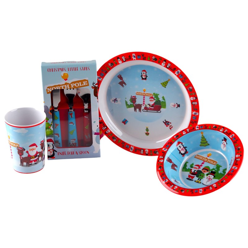 Christmas Santa 4 Piece Melamine Kid's Dinner Set - Plate, Bowl, Cup, Metal Cutlery