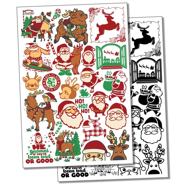 Christmas Santa and Reindeer Holiday Temporary Tattoo Water Resistant Fake Body Art Set Collection - Black (One Sheet)