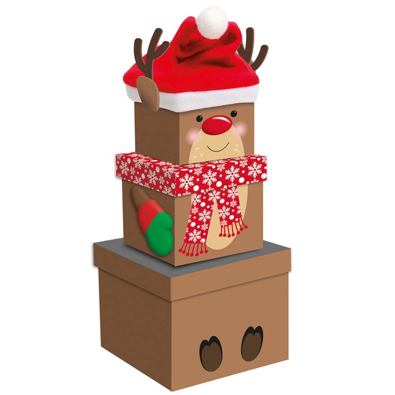 - STYLISH FESTIVE DESIGN - This set of boxes has a really special Reindeer design. The top box has a Reindeer face with a bobble hat and ears for a lid, the middle box comes with arms on the side, the base is designed with a reindeer body with paws
