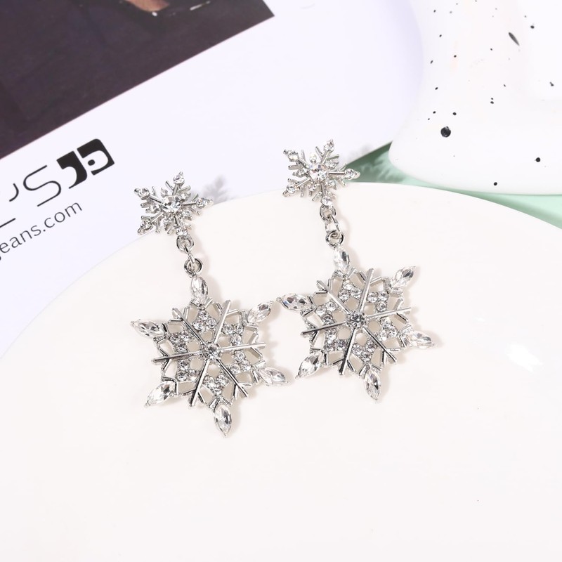 - ღRhinestone Snowflake Earrings ღWhether you're celebrating Christmas or just the colder weather, these Xmas snowflake flower drop earrings are the perfect accessory! features a very beautiful and delicate silver plated snowflake front with clear cubic zirconia. A great earring to show your love of winter, or to express the Christmas spirit.
