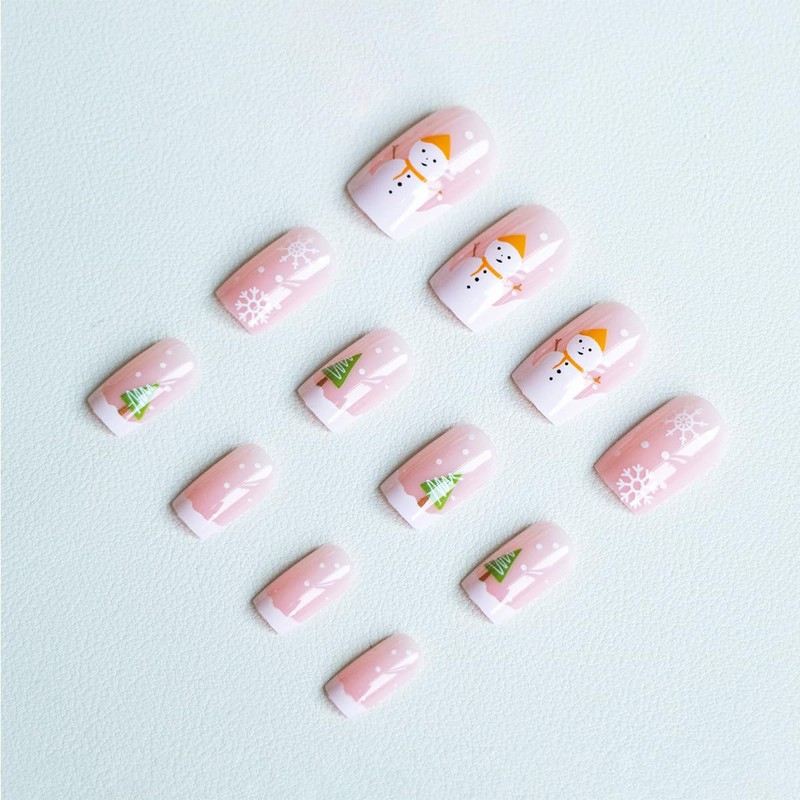 Christmas Square Press on Nails Short Square Winter Snowflake Fake Nails Nude Pink Cute Christmas Nails with Snowmen Tree Designs French Tip Acrylic Nails Glossy Artificial False Nails for Women 24Pcs