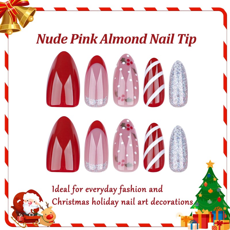 - đ ăChristmas Theme Nail Artă:Christmas false nails are designed with classic Christmas elements, burgundy red, nude pink, sparkly nails, candy stripes nail art. 24PCS long almond false nails in 12 different sizes to meet all your needs that make your nails shine at the Christmas party