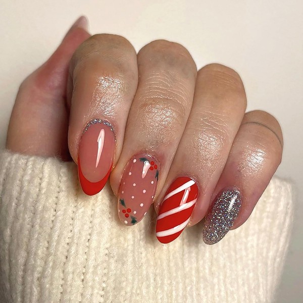 - đ ăChristmas Theme Nail Artă:Christmas false nails are designed with classic Christmas elements, burgundy red, nude pink, sparkly nails, candy stripes nail art. 24PCS long almond false nails in 12 different sizes to meet all your needs that make your nails shine at the Christmas party
