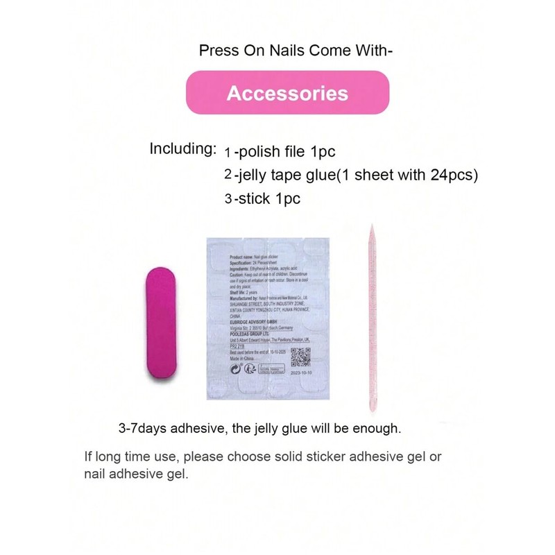 - ✅ PACKAGING CONTENT: 10 pcs Handmade Press-on nails, Each set comes complete with a storage box, 24 adhesive pieces, double-sided nail file, cuticle stick. If you want to wear it for a short time, please use adhesive pieces. If you want to wear it for a long time, please use glue, which can last longer.