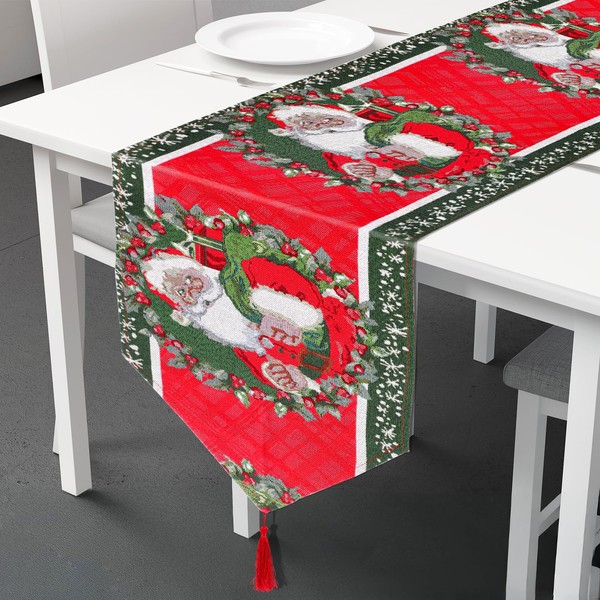 - Delicate Christmas table decoration: the Christmas table runner from Pwsap has a delicate and warm pattern, including Santa, wreath, holly and snowflake. Its dangling tassels add even more elegance to your table. With classic colours and vibrant print, this winter table runner fits perfectly with your Christmas table and helps to dramatically enhance the Christmas cheerful atmosphere.