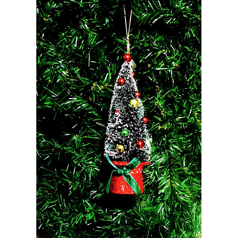 CHRISTMAS TREE ORNAMENT w/DECORATIONS & SNOW w/ATTACHED GIFT STYLE TREE STAND