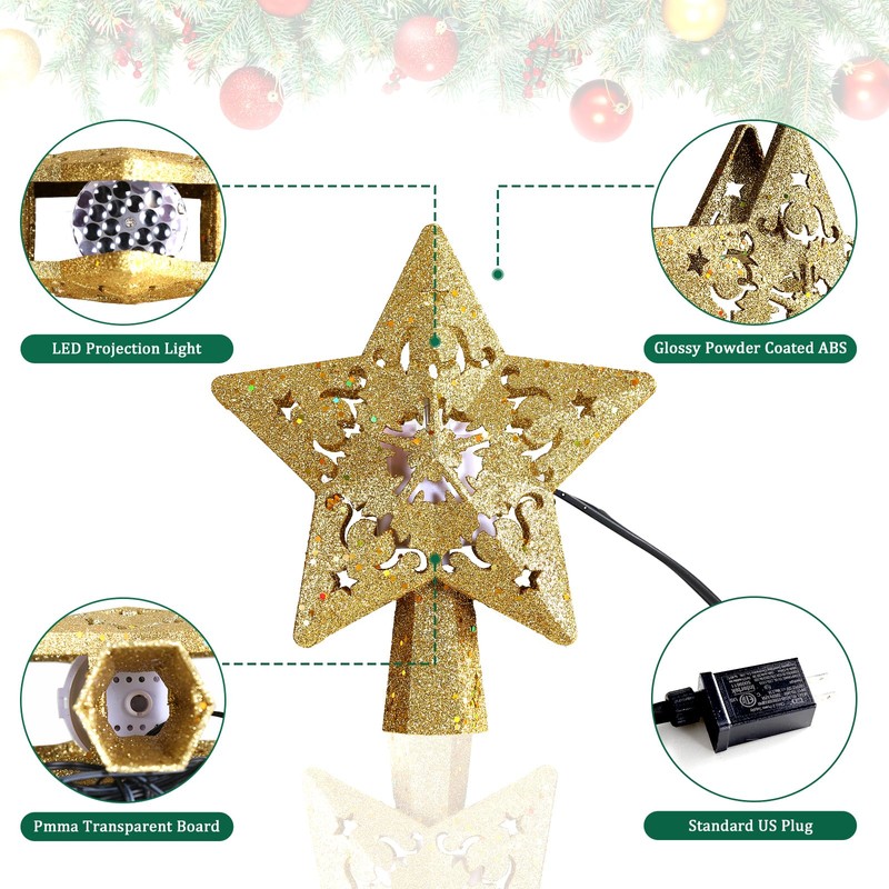- 【CHRISTMAS TREE DECORATION】 - This Christmas tree topper features 3D hollow-out design with sparkling powder. The 9.84ft US Standard plug wire also enough to make the star tree topper easy to connect, add sparkling light to your Christmas tree, making your Christmas unique