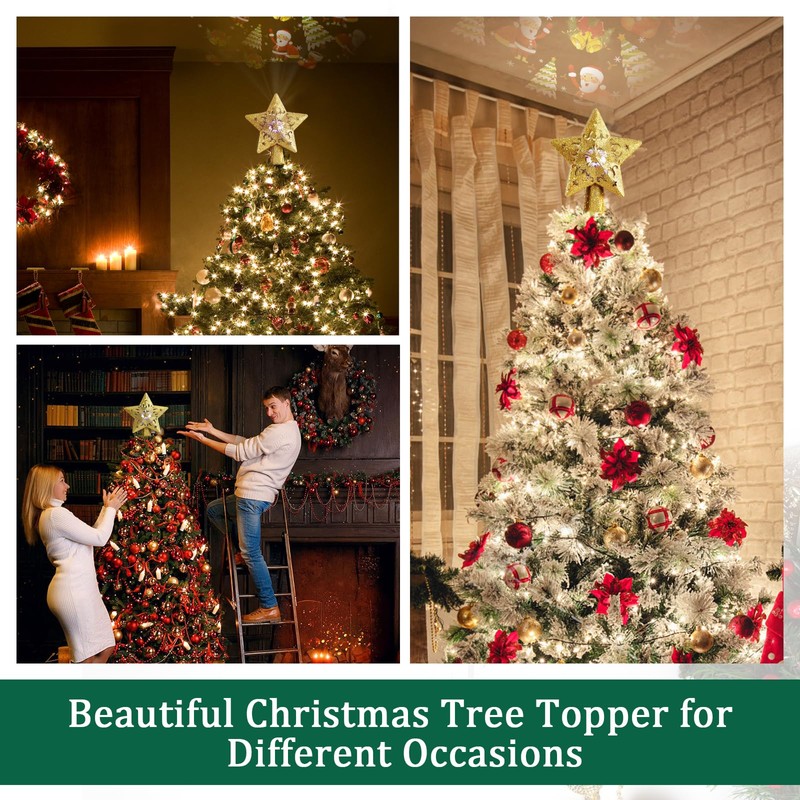 Our light tree topper features a hollow-out Star design, built-in LED projector designed with a conical cone base for attaching to the tree easily. Add sparkling light to your Christmas tree and bring a warm Christmas ambiance to your family.