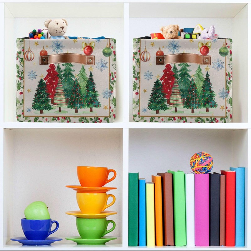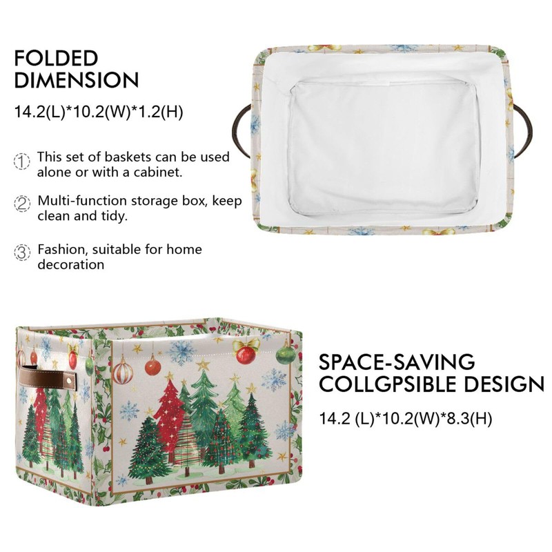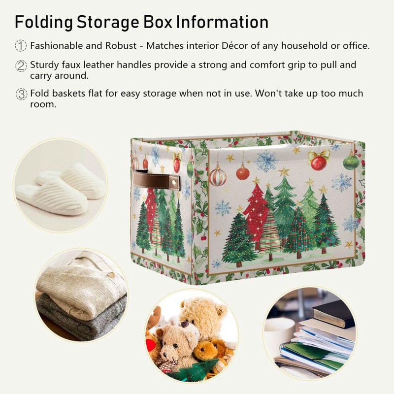 Christmas Trees Snowflakes Storage Basket Holly Leaf Berries Fabric Storage Organizer Box Bins Large Collapsible Cube Baskets Boxes with PU Handles for Kitchen Shelf Closet Nursery Laundry 1 Pack