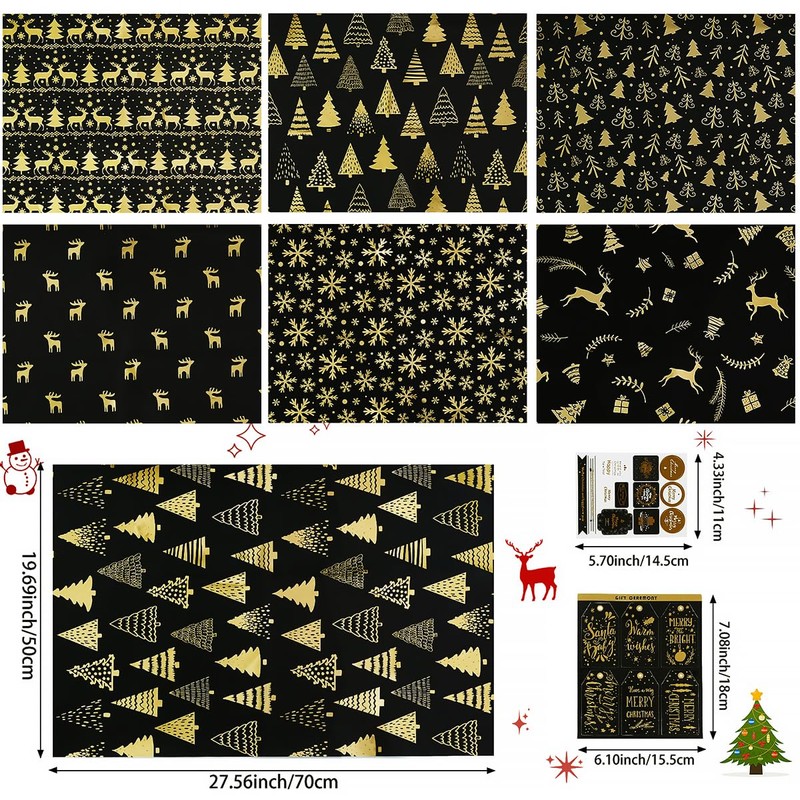 - 【Black & Gold Christmas Wrapping Paper Set】This wrapping paper set includes 6 sheets of wrapping paper in 6 different designs, 1 sheet for each design. Wrapping paper with labels (6 pieces), stickers (12 pieces) and wrapping ribbon (4 metres, 2 metres for each gold and silver), wrapping paper with accessories for your practical gift wrapping project