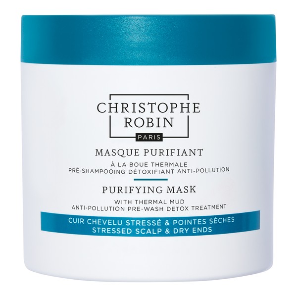 Christophe Robin Purifying Mask With Thermal Mud 250ml is a detoxifying pre-wash treatment that helps draw out the build-up of impurities and pollution, leaving the scalp feeling comfortable, roots freshened, and hair soft, manageable, and healthy-looking.