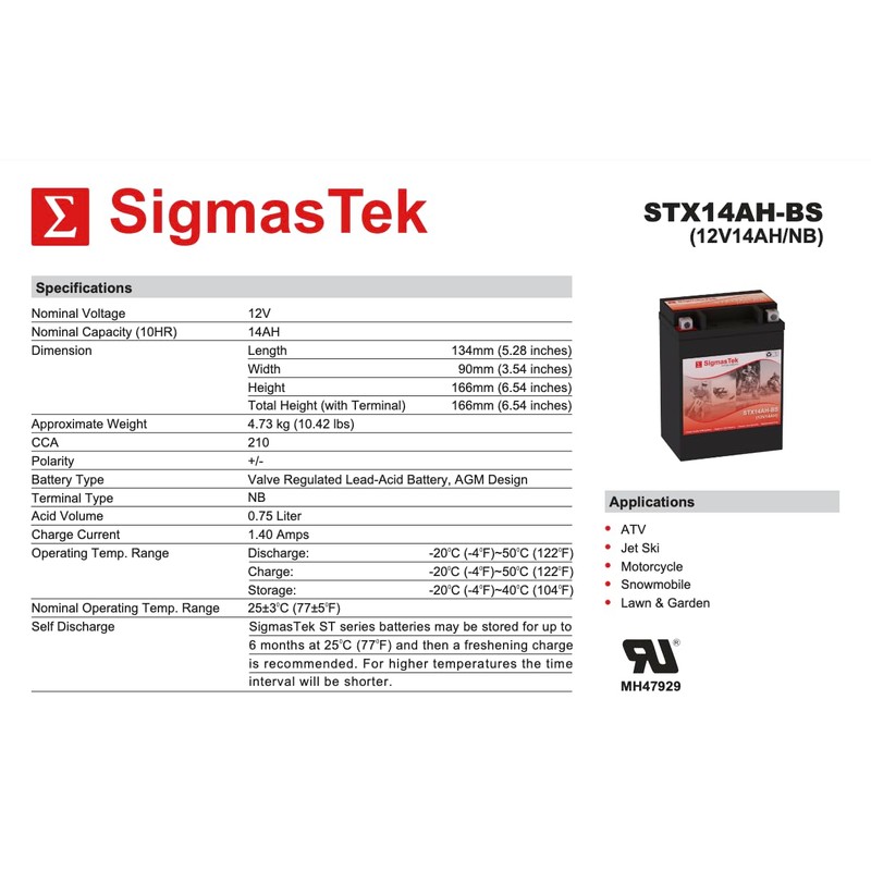 - EASY APPLICATION: SigmasTek Powersport batteries come fully charged and ready to go. Simply connect your battery to the application.