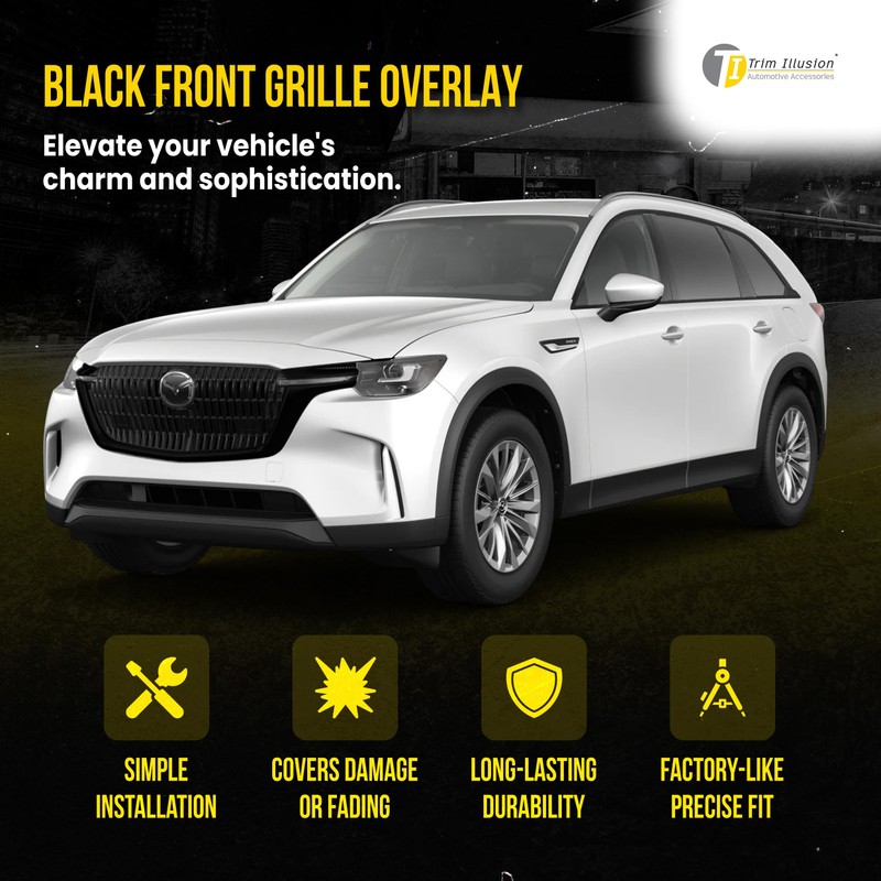 - COMPATIBILITY - Gloss black car front grille overlay compatible with Mazda CX-90: 2024. 4 Pieces. Upgrade your ride with our patented design, gloss black grille trim. Precision fit and unmatched quality, ensuring your vehicle stands out in style. Limited Lifetime Warranty.