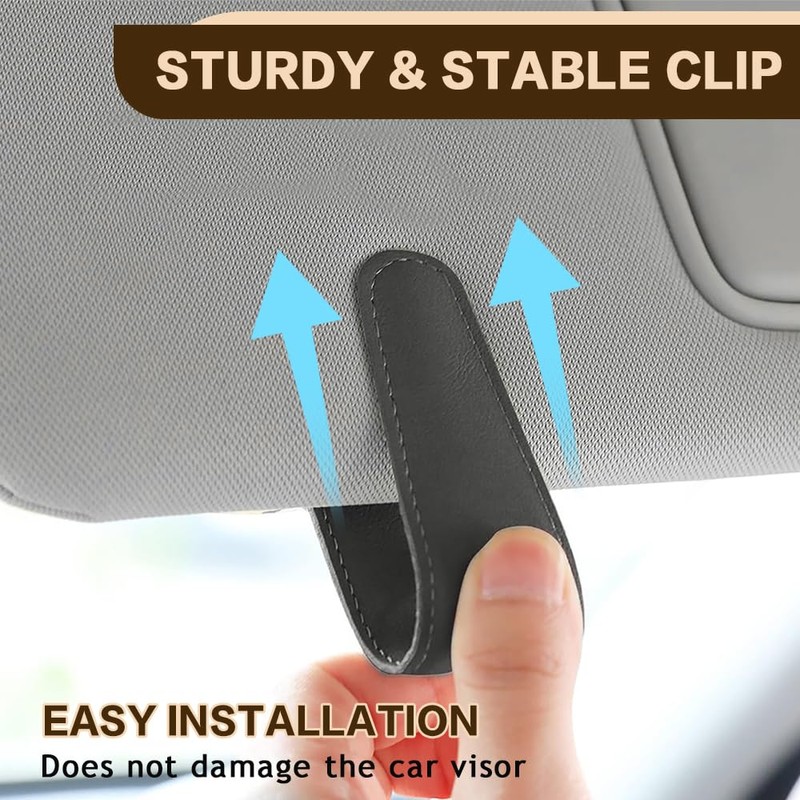- [Durable material] : The car sunglass holder is made of high-quality leather materials, with soft and tough, strong and wear-resistant, not easy to damage, not easy to leave dirt, easy to clean characteristics. Comfortable to touch, smooth and elastic, it will not scratch glasses and car sunshades when used, and can be used for a long time.
