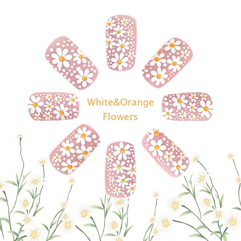 Chrysanthemum Press on Nails Medium Square Fake Nails White Orange Flower Stick on Nails Glossy Glue on Nails Full Cover Artificial Nails Reusable Acrylic False Nails Kit for Women Girls 24Pcs