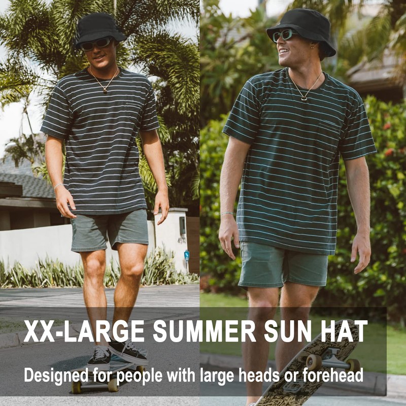 - ☀️【Oversized Bucket Hat for Men and Women】-- If you have a big head or thick hair and looking for stylish bucket hat, our reversible travel sun hat is the best choice for you. XX-Large fits heads 24.5"-25.5" Designed for people with large heads or forehead, suitable for all seasons. The bucket hat is assured to cover around 99.5% UPF 50+ sun protection, which provides excellent full coverage for the face, neck, and other sensitive areas, perfect for anywhere you go.