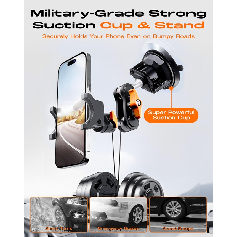 - Durable Suction Power – Long-Lasting, Trace-Free Mounting: Equipped with an industrial-strength vacuum suction cup and one-click locking mechanism, the mount holds tight to smooth surfaces without leaving residue; Tested for durability and reuse—ideal for cars, trucks, and SUVs
