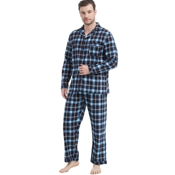 CHUNG Men Cotton Pajamas Set Soft Flannel Plaid Long Sleeve Tops Pants Warm Sleepwear (X-Large, Light Blue)