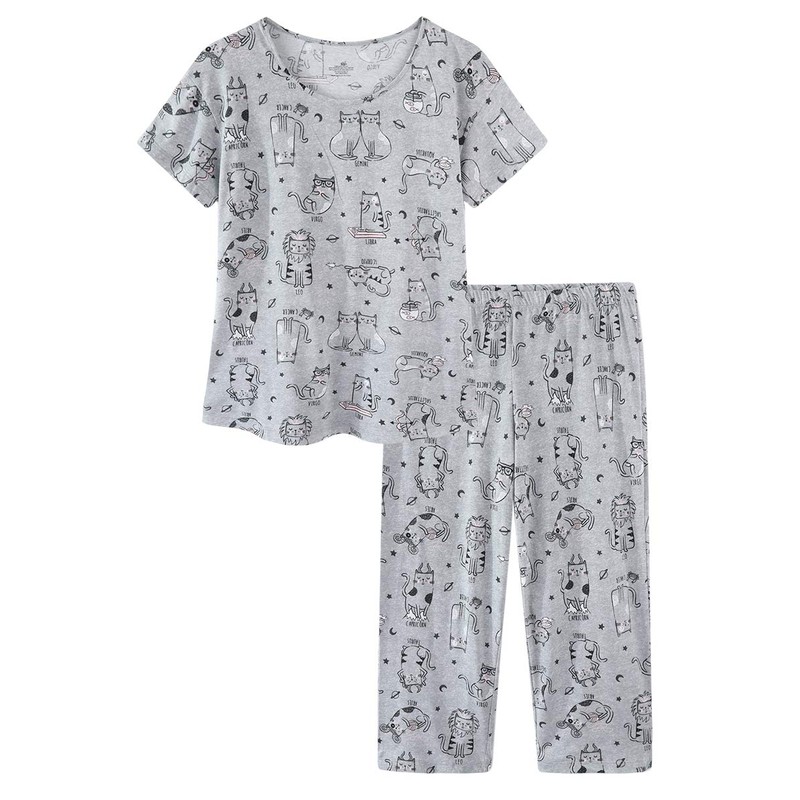 CHUNG Women Cotton Blend Pyjamas Set Short Sleeve Top Capri Pants Plus Size S-3XL Sleepwear Nighties Grey Cat,L