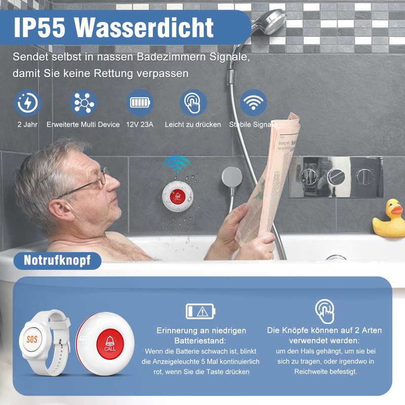 - Waterproof care bell: emergency call bracelet for seniors for home is waterproof. Emergency button acceptable for fixed in bed / laundry room and holster, emergency call button lightweight and portable, applicable in the following places: home, care house, clinic, hospital, villas, clubs, etc