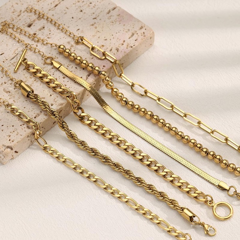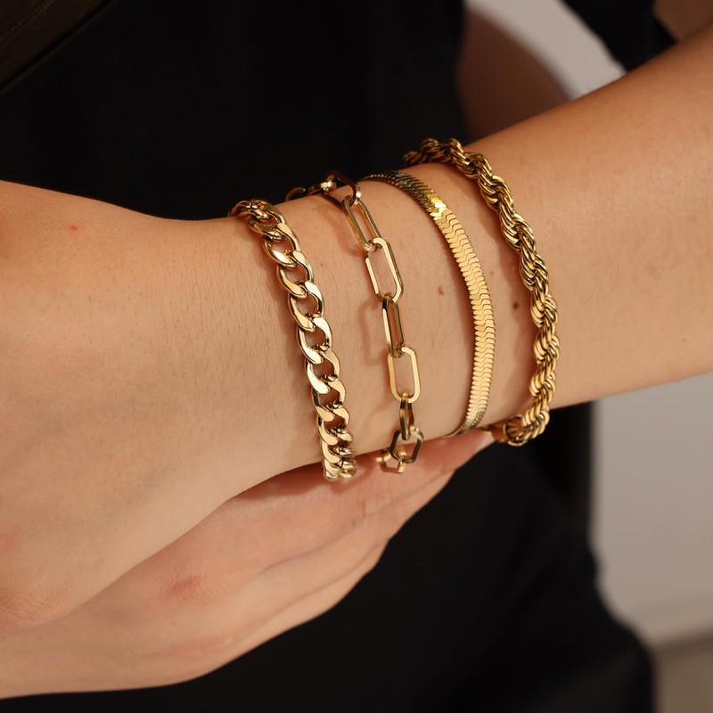 - Gold Bracelets Stack: Comprises cable chain bracelets, herringbone bracelets, cuban chain bracelets, paperclip bracelets, and beaded bracelets. Ideal for both layering and solo wear, and it will be classic and elegant.