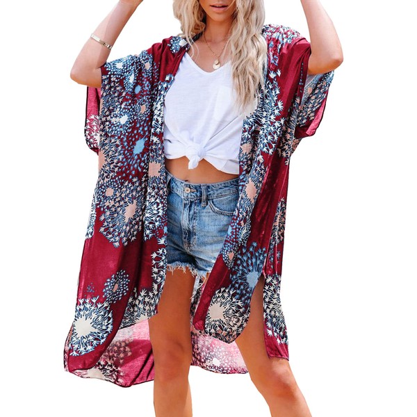 Chunoy Women Open Front Short Sleeve Floral Print Midi Side Slit Kimono Cover Up Beach Wear Blouse Top Wine Red X-Large