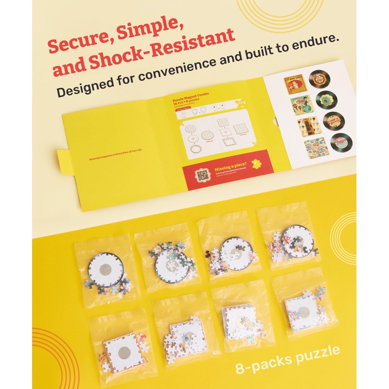 - PieceRelax X Chupa Chups: This magnetic puzzle set showcases classic logo designs. Featuring 8 unique patterns, it delivers a distinctive and enjoyable puzzle experience. Each completed puzzle measures 2.17 inches in both length and width.