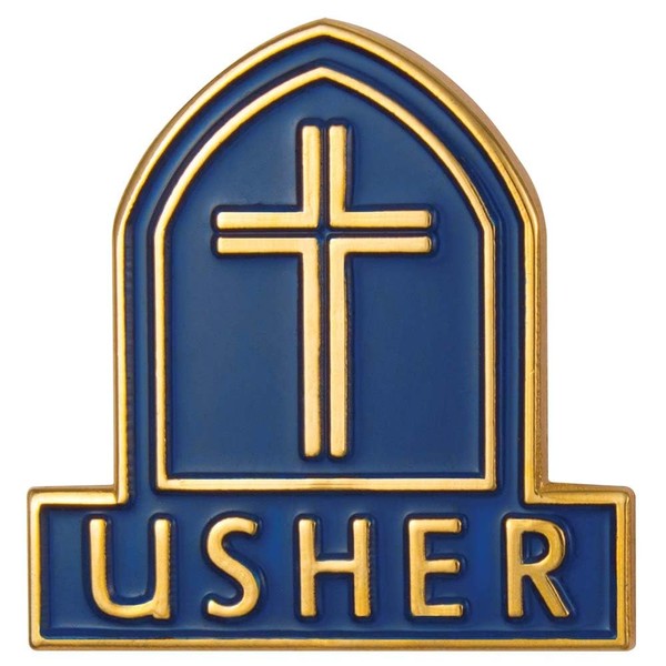- Blue and Gold Church User lapel pin with cross that makes a great item to help identify church member, who assists anyone in the congregation who might need help or to aid latecomers in finding a seat