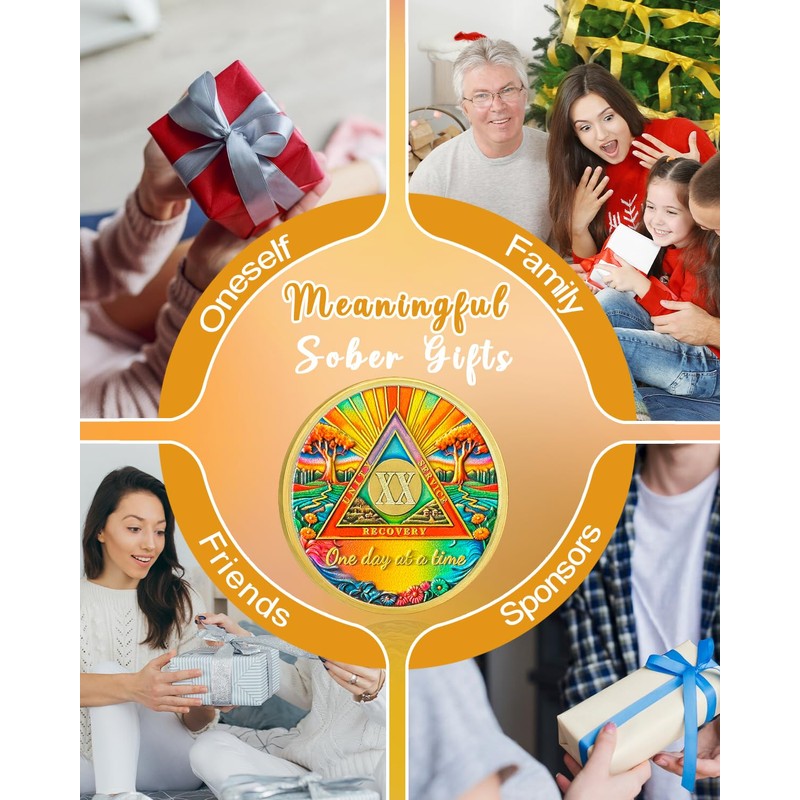- Stunning Original Design: This 20 year sobriety coin design carries deep symbolism. The central triangle, framed by sun rays, represents new beginnings, hope, and recovery. The trees stand for resilience, while the flowers at the base highlight the beauty and renewal that come with sobriety. The phrase "One day at a time" encourages staying present and moving forward step by step. On the back, the Serenity Prayer serves as a powerful reminder to face life’s challenges with calm and acceptance