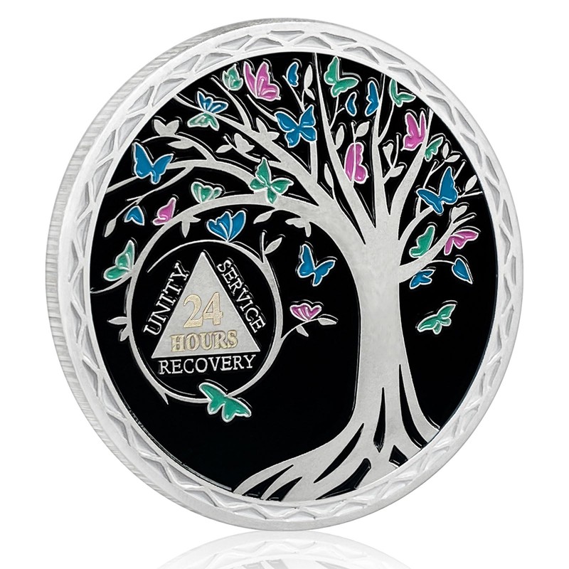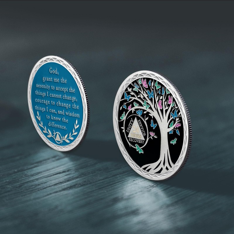 - 【Beautifully Engraved Design】Front side of butterfly aa coin is engraved with a strong tree of life surrounded by pink, green and blue enamel butterflies, "UNITY, SERVICE, RECOVERY" Three Legacies Motto, the special laser number signifying the length of sobriety. On the reverse side, you'll find the Serenity Prayer, a poignant reminder to face life's challenges with equanimity