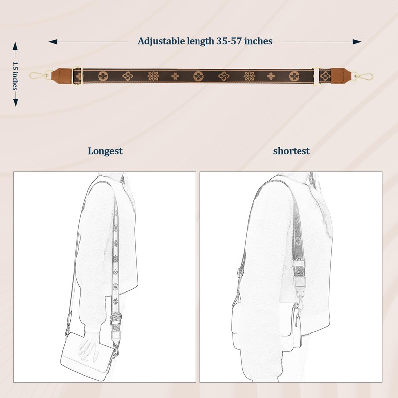 - FUNCTION: The crossbody straps are easy to stretch and adjust, adjustable in length from 31 to 57 inches. The bag strap is about 1.5 inches wide. The light gold hardware buckle can be rotated 360 degrees for easy installation and replacement.