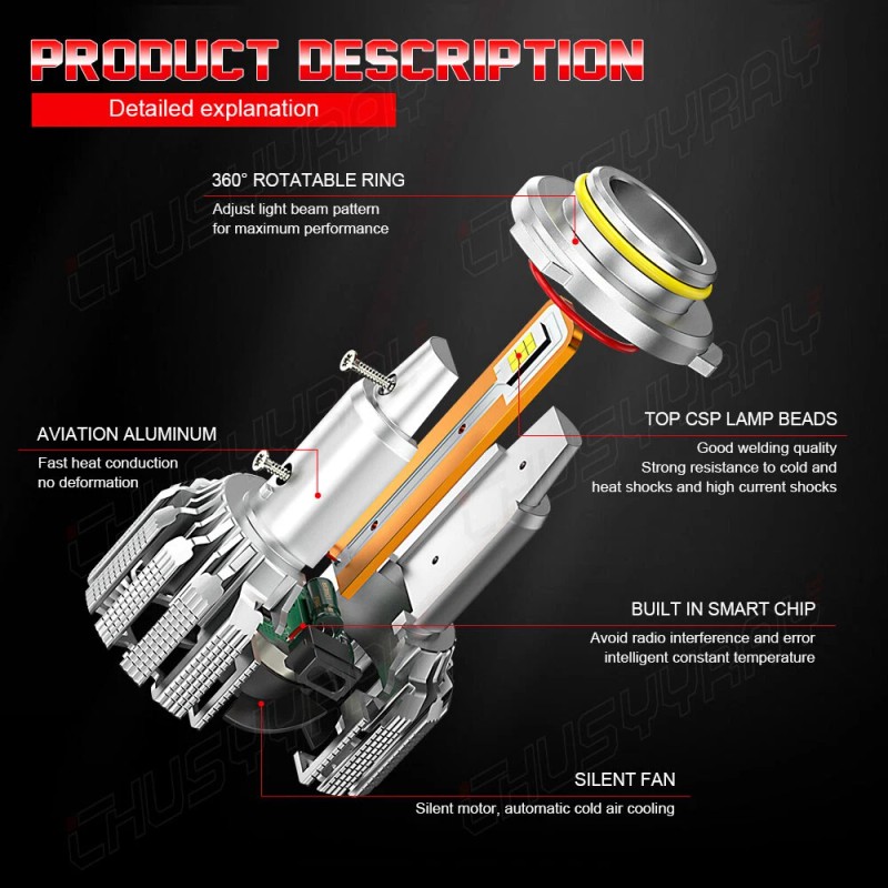 3. Fast cooling , the appearance of the most advanced design , thermal structure ingenious and reasonable.Less warranty, power driver with wide voltage constant current mode , the car can respond to a variety of voltage instability , the effective protection of normal use Led efficient and simple structure . Fewer Components damaged, repair the probability is very low , compared with HID ballast repair lower than 80% .