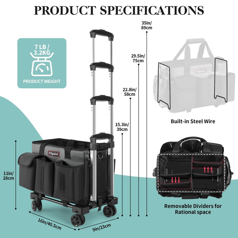 - Superior Quality: The cleaning supplies organizer bag has a durable, easy-to-clean hard bottom with a folding metal frame for extra stability. The waterproof cleaning bag is made of PVC-coated 1680D Oxford cloth. Cleaning cart with telescopic pole adjustable in height (15.3in-35in) and angle (40°-90°)