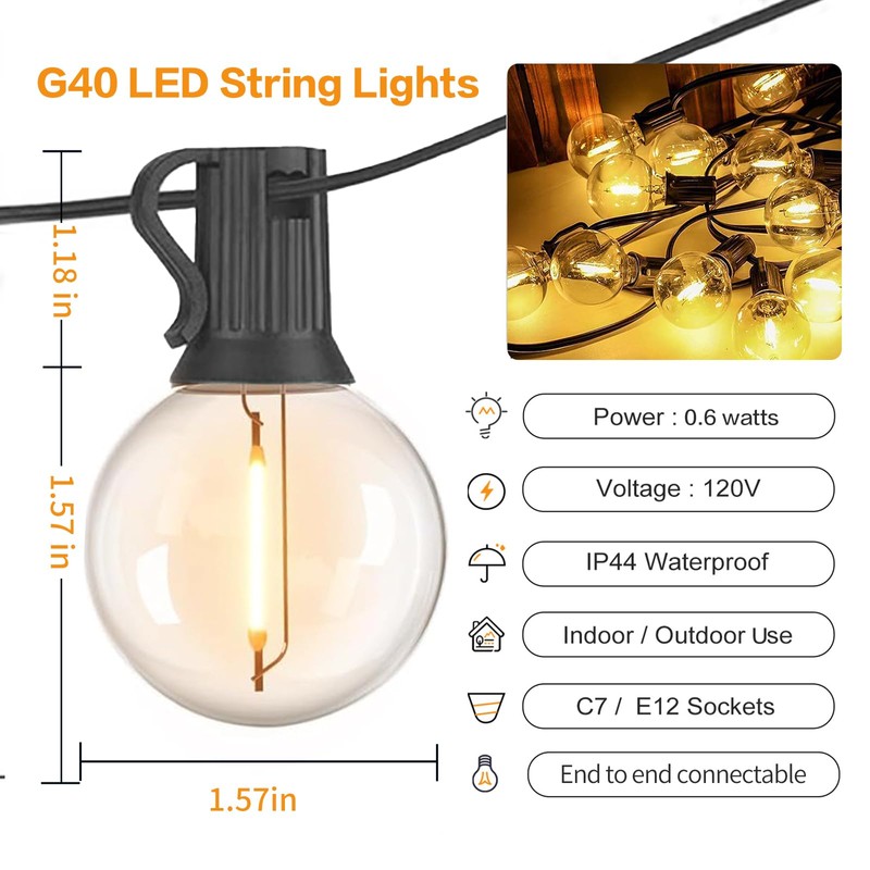 • Shatterproof Material: G40 outdoor string lights made from high-strength, durable plastic, it resists accidental drops and impacts. Perfect for shatterproof outdoor string lights, eliminating concerns about broken bulbs