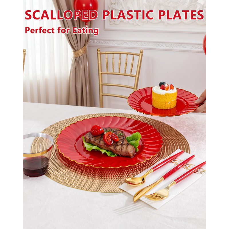 - Elegant Design: The red plastic plates with gold rim create a striking impression at any event, enhancing the table setting with an air of elegance and refinement.Whether for a wedding, showers, or special event, scalloped plastic plates exude elegance, complementing any color scheme or decor style and making your table look both upscale and timeless.
